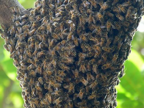 These are honey bees swarming around a tree. They may be wild or they may have split from a domesticated hive. Bees may also swarm around a residence and even nest within the walls. When this happens, honey may be seen seeping into a home when the weather is very warm. Many people are allergic to honey bees. Effects of a sting may range from swelling and hives to difficulty breathing and death.